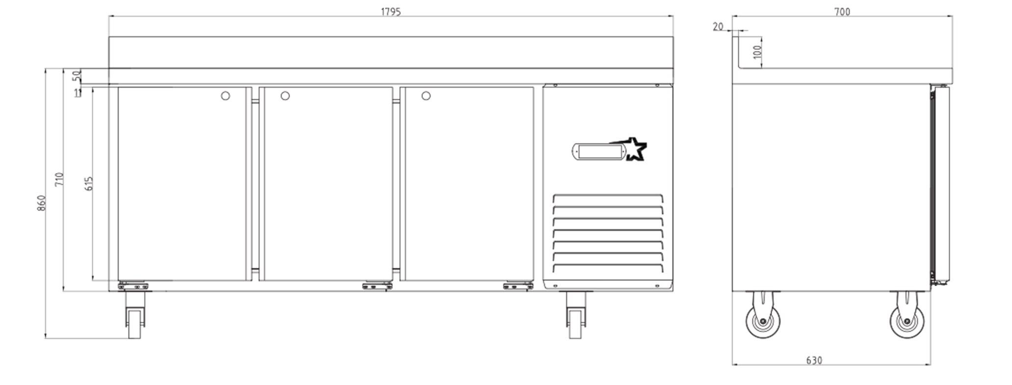 THREE DOORS COUNTER REFRIGERATOR WITH UPSTAND